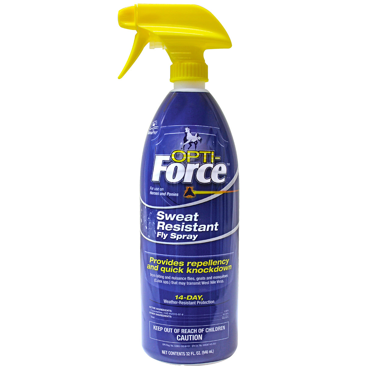 Fly spray for use on horses and ponies. Provides repellency and a quick knockdown of biting and nuisance flies, gnats and mosquitoes (Culex spp) that may transmit West Nile virus. Sweat-resistant with 14-day weather resistance protection.