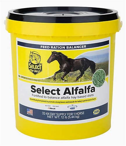 Select the Best Select Alfalfa Select Alfalfa is specially formulated to complete and balance diets consisting of Alfalfa Hay, which are typically high in calcium and lower in phosphorous. It provides all the key amino acids, Zinpro trace minerals, vitamins, and Yea-Sacc digestive support, along with the addition of adequate levels of calcium and phosphorus that need to be balanced in an Alfalfa Hay-based feeding program. Features: Advanced formula customized to balance Alfalfa Hay-based diets Palatable pelleted formula Contains Zinpro trace minerals, which have shown to have better absorption Contains Yea-Sacc to help stimulate and stabilize proper microbial function, which aids in supporting proper digestion of calcium and phosphorus Item Specifications: Sizes: 6 lb. 12 lb. Guaranteed Analysis per lb.: Crude Protein (min.): 11% Crude Fat (min.): 5.0% Crude Fiber (min.): 9.5% Saccharomyces cerevisiae (Yea-Sacc(R)): 133 billion CFU Lysine (min.): 1.0% Methionine (min.): 1.3% Calcium (min.): 0.58% Calcium (max.): 0.60% Phosphorus (min.): 5.8% Salt (min.): 2.7% Salt (max.): 2.8% Sodium (min.): 5.3% Sodium (max.): 5.4% Chlorine: 2.7% Magnesium (min.): 2.9% Zinc (min.): 4400 ppm Manganese (min.): 1818 ppm Copper (min.): 1349 ppm Iodine (min.): 23 ppm Cobalt (min.): 18 ppm Selenium (min.): 12 ppm Vitamin A (min.): 80,000 IU Vitamin D (min.): 13,334 IU Vitamin E, (min.): 2,666 IU Thiamine (min.): 1067mg Riboflavin (min.): 853mg Ingredients: Mono Ammonium Phosphate, Stabilized Rice Bran, Suncured alfalfa Meal, Salt, Zinc methionine mineral complex, Manganese methionine mineral complex,, Copper lysine mineral complex, Cobalt glucoheptonate mineral complex, Saccharomyces cerevisiae, Magnesium oxide, Dried molasses, Calcium carbonate, d-alpha-tocopheryl acetate (source of Vitamin E), Selenium yeast, Calcium lignosulfonate (binder), Sodium lignosulfonate (binder), Ammonium lignosulfonate (binder), L-lysine hydrochloride, Sodium salts of fatty acids, Sodium carboxymethyl-cellu