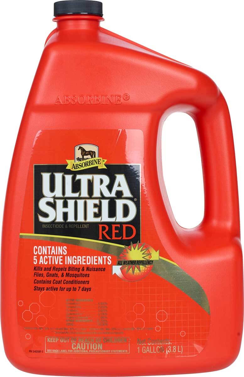 Absorbine UltraShield Red kills and repels in 5 different ways. Contains five active ingredients for broad spectrum control. Kills and repels flies, gnats and mosquitoes for up to 7 days. Protects against horse flies, stable flies, face flies, horn flies, deer flies, house flies, black flies, barn flies, cluster flies, sciarid flies, gnats, midges, punkies, no-see-ums, chiggers and fleas. Also kills ticks.